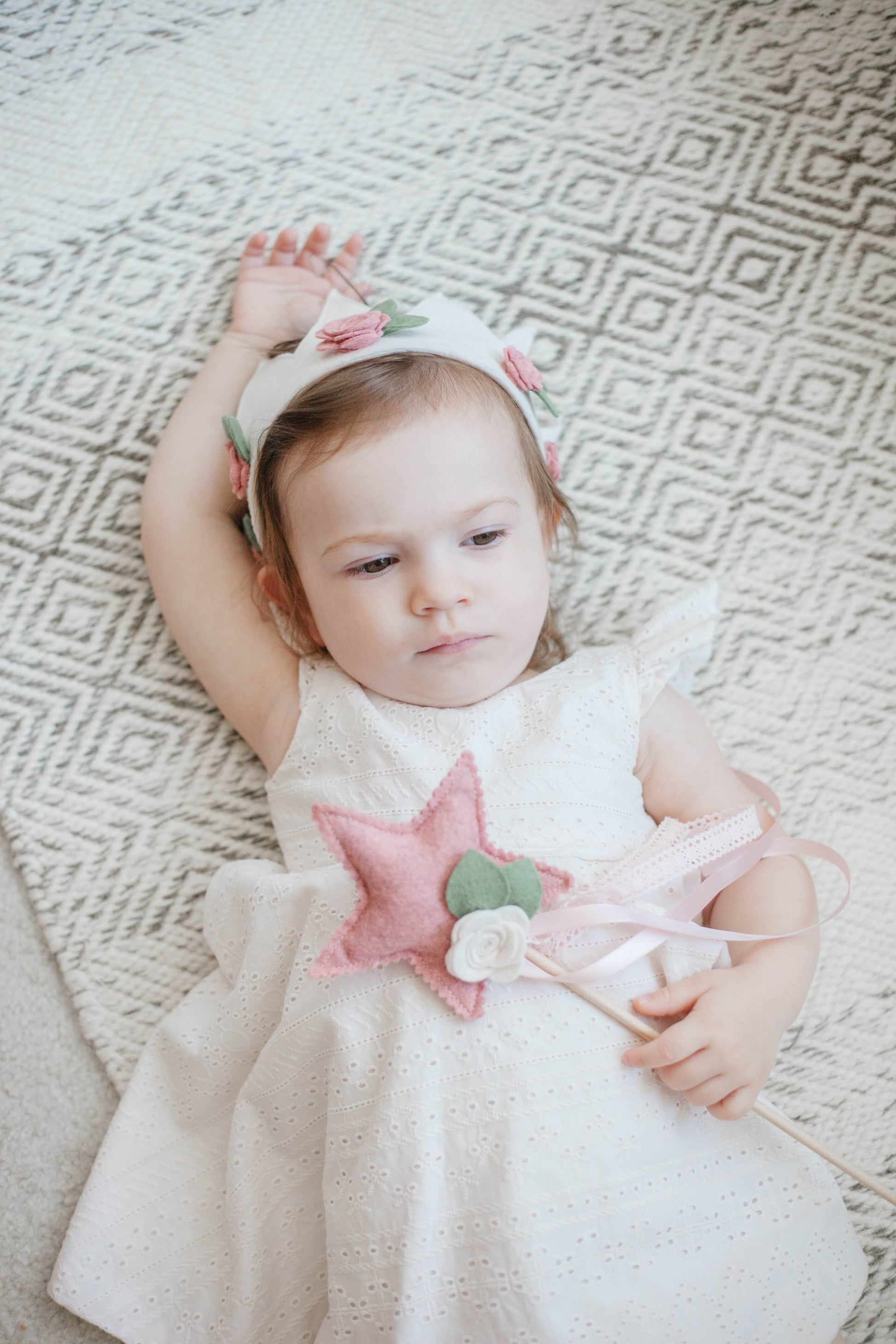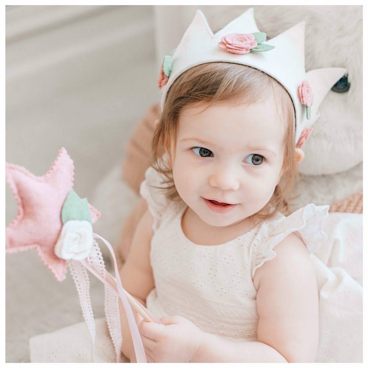 Crowns have the option to be fastened with a super soft nylon elastic strip or with beautiful satin ribbon lace. Many moms prefer the look and aesthetic appeal of the lace ribbon but if your little one is like mine, and doesn't like sitting in one spot for too long then i'd recommend opting for the nylon strip!